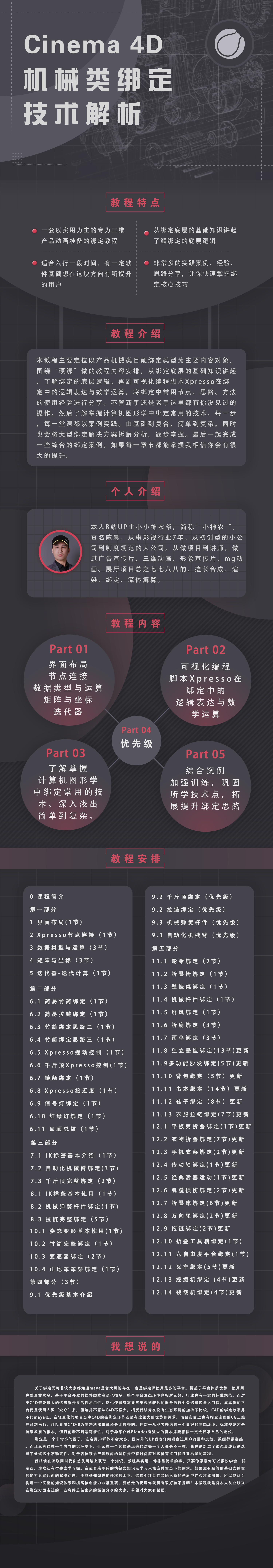 经过三个月的筹备,我的绑定教程终于发布了。本教程主要以机械类的绑定为主,教程总共12(11+1)个章节,125(53+23+29+20)小节,总计时长46.5(19.9+9.4+10.2+7)小时,教程包含了教学视频和配套文件。为大家详细讲解了机械类绑定的干货技巧、绑定思路方法以及个人的经验总结,相信对大家一定有所帮助。目前教程只在B站工房面向大家,暂时没有去入驻学习资源的平台,平台的分成也会增加成本。